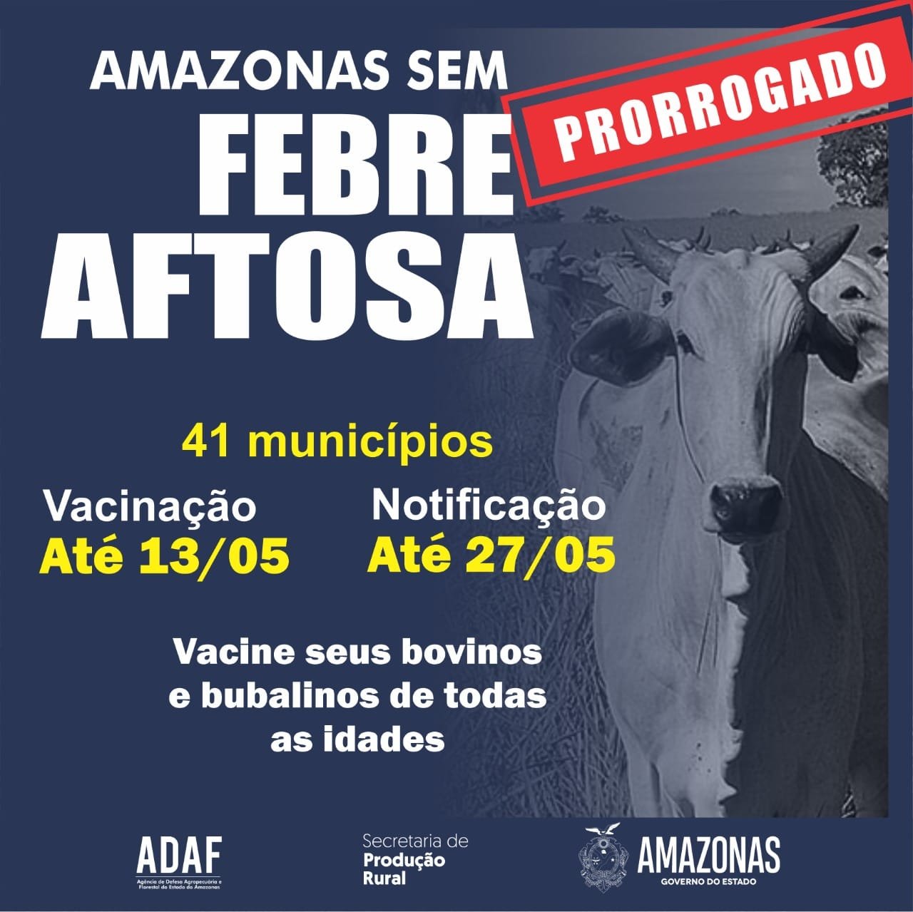 O prazo para a notificação da vacinação junto à Agência de Defesa Agropecuária do Estado do Amazonas (Adaf) também foi dilatado e seguirá até o dia 27 de maio. Quem não vacinar seu gado estará sujeito a multa de R$ 40 por animal, e R$ 300 por propriedade.