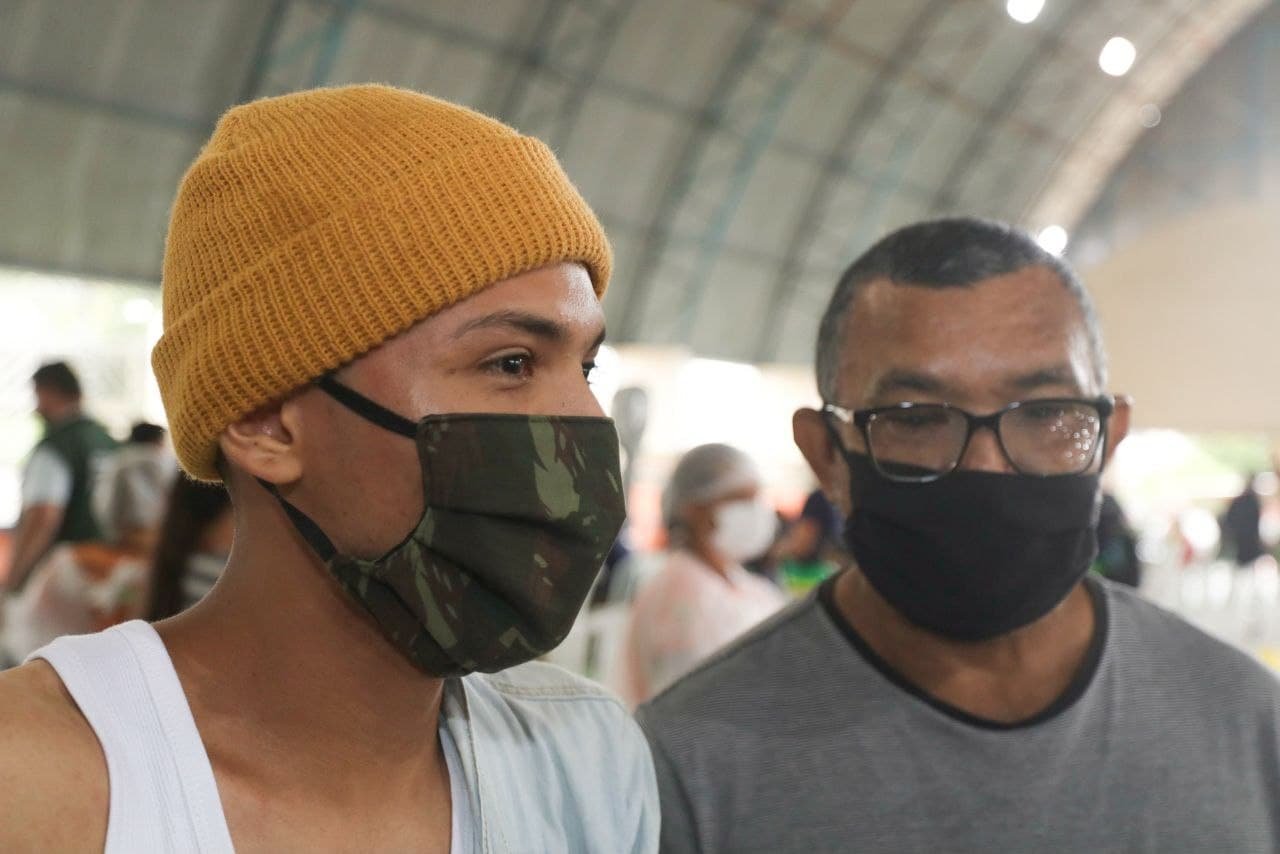 Claudionor, 56, e Nelson Malcher, 20 – pai e filho, celebraram a vacinação para maiores de 20 anos aberta em Rio Preto da Eva, no início da tarde deste sábado (03/07). A faixa etária, que inicialmente era de 25 anos, foi ampliada pelo governador Wilson Lima. Já vacinado há alguns meses, Claudionor foi acompanhar a imunização do filho contra a Covid-19.