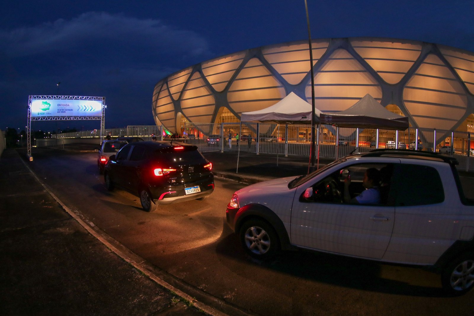O acesso dos carros à área de vacinação da Arena da Amazônia está sendo feito pela rua Lóris Cordovil e rua Jornalista Flaviano Limongi (via entre a Arena da Amazônia e o Sambódromo). Os portões foram abertos para o acesso dos carros aos 30 postos exatamente às 18h.