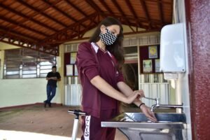 As unidades dispõem de pias e totens/dispositivos de álcool gel e sabão, para que os estudantes e demais membros da equipe escolar possam higienizar corretamente as mãos. Além disso, as escolas estão equipadas com tapetes sanitizantes e sinalizações com os principais protocolos e medidas de segurança de enfrentamento à Covid-19.