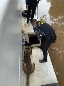 Após inspeção, em uma das balsas com o auxílio dos cães Xerife e Delta da Companhia Independente de Policiamento com Cães (CipCães), foram localizados os entorpecentes em sacos de fibra, dentro de um espaço vazio da balsa.