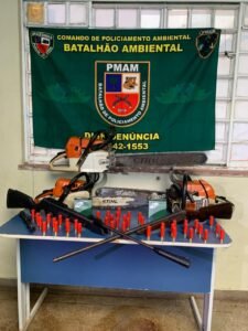 Em ação por volta das 14h da terça-feira, após denúncia anônima, policiais do BPAmb detiveram um homem em posse de três motosserras da marca Stihl; duas espingardas de calibres 16 e 5.5; 42 munições calibre 16 intactas; e uma luneta da marca Eagle. Ele se encontrava em uma embarcação na orla de Manacapuru. O indivíduo recebeu voz de prisão e foi conduzido, juntamente com o material apreendido, ao 1º Distrito Integrado de Polícia (DIP) de Manacapuru.