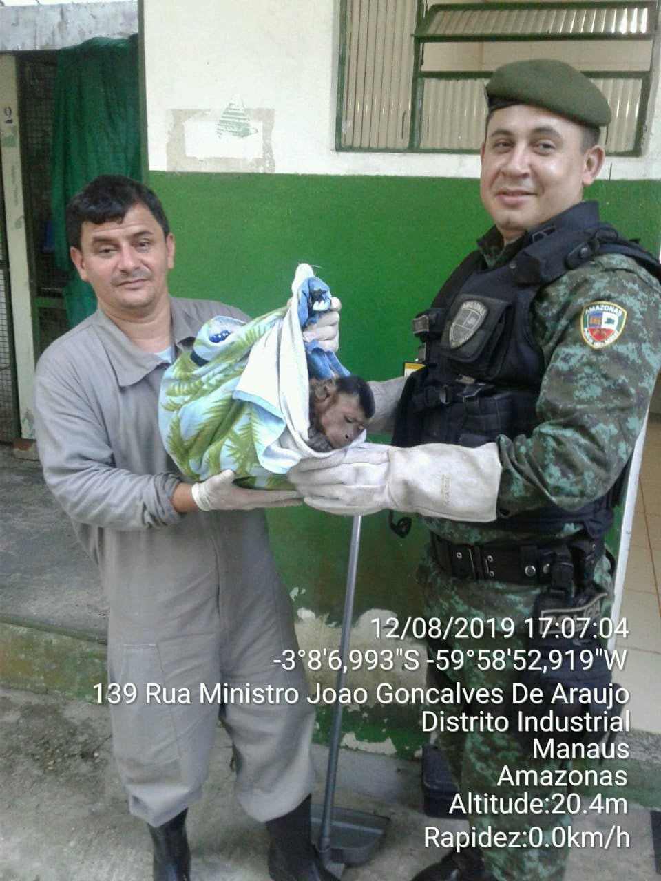 Chegando ao endereço, os policiais militares encontraram o animal ainda muito assustado e procurando se esconder dos ataques dos cachorros. Os policiais efetuaram o resgate do macaco-prego, constatando que o animal estava ferido no pescoço, com sinais de mordida.