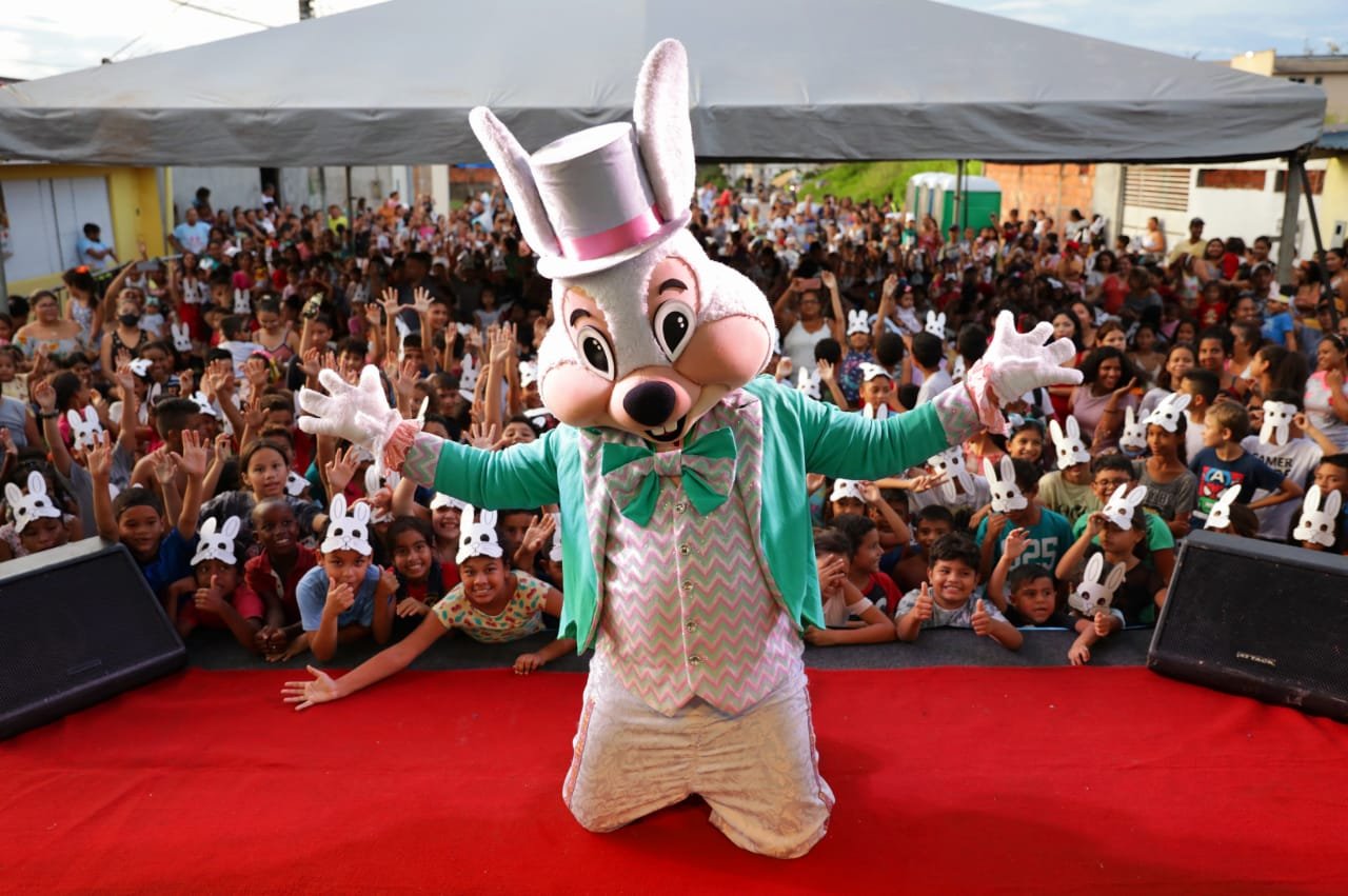 A Caravana da Páscoa chegou ao Residencial Viver Melhor, na zona norte de Manaus, na noite de quarta-feira (13/04). O projeto do Governo do Amazonas, por meio da Secretaria de Estado de Cultura e Economia Criativa, em parceria com o Fundo de Promoção Social (FPS), levou para a rua Japiassú um circuito cultural com o espetáculo “Uma Páscoa na Floresta”, da Cia de Teatro Metamorfose; chegada do Coelhinho e show da cantora Jôci Carvalho.