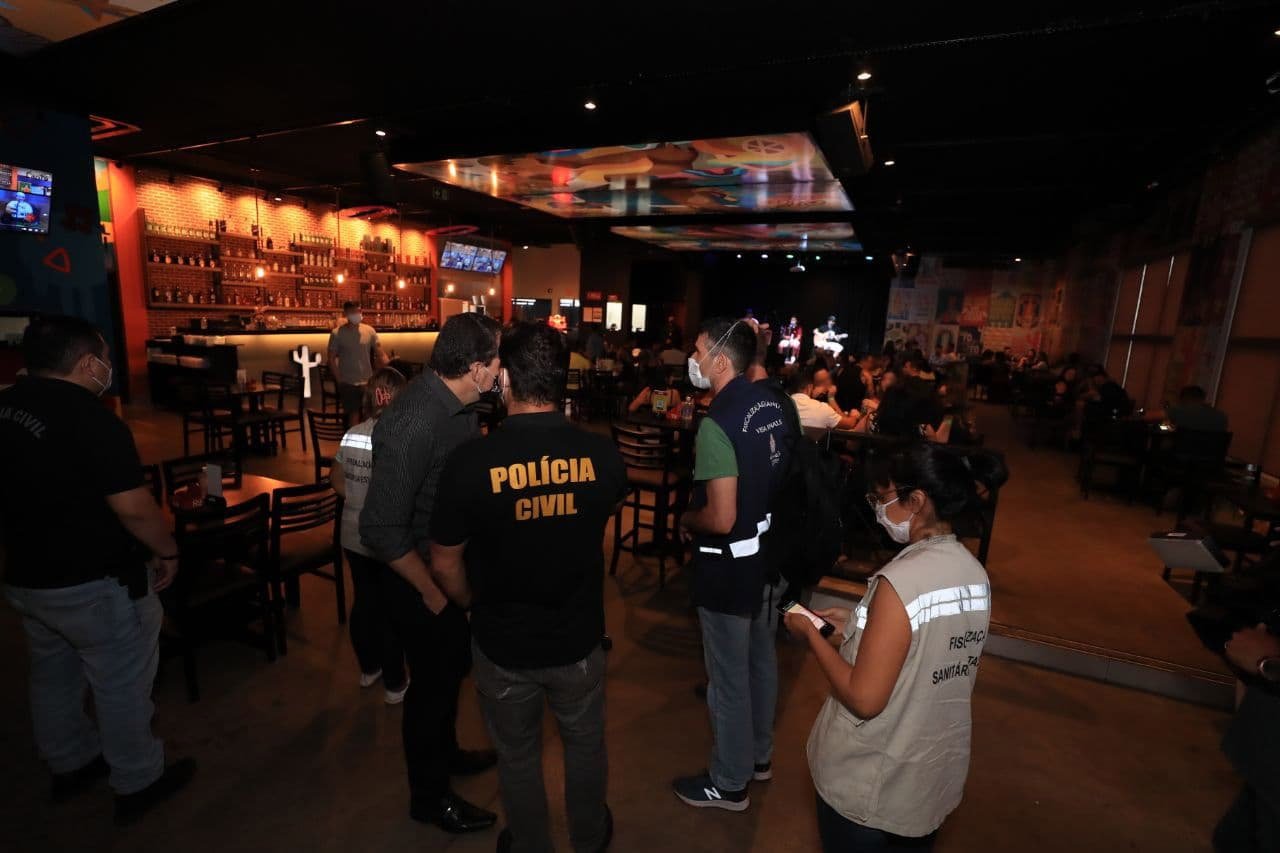 No entanto, no turno noturno, as ações foram para além de orientações. As forças integradas vistoriaram 16 estabelecimentos comerciais nas zonas leste, norte e sul de Manaus. Destes, 10 locais foram orientados a finalizarem suas atividades, sendo um deles um bar, que foi autuado por promover uma festa clandestina. E uma outra festa foi encerrada por denúncias de aglomeração feitas pela vizinhança.