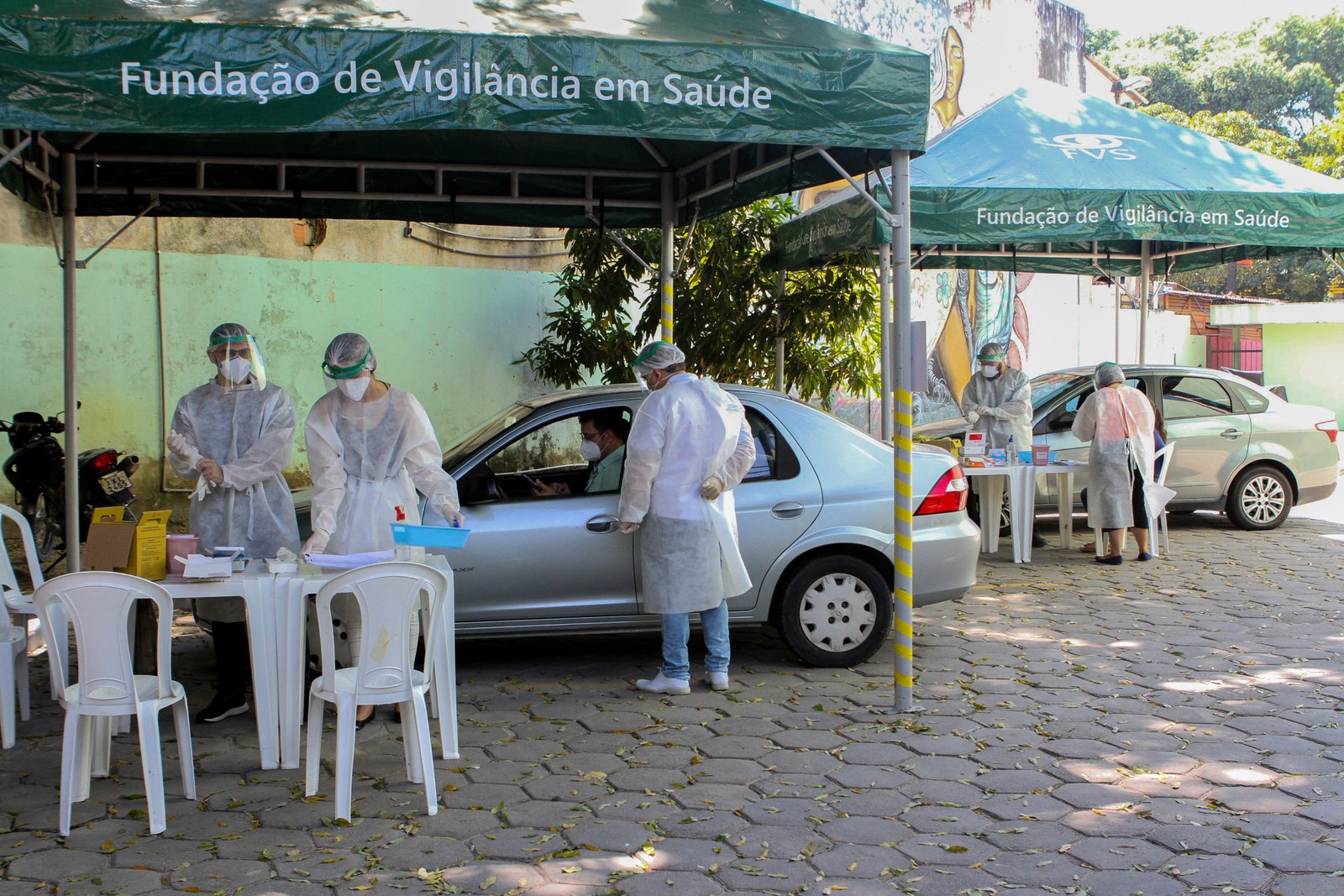 As coletas eram feitas no sistema drive-thru, permitindo que os profissionais ficassem dentro dos veículos, minimizando o contato e descartando aglomerações.