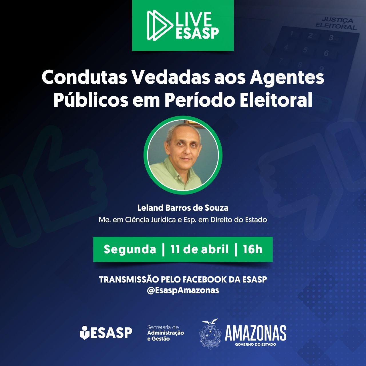 A Escola de Aperfeiçoamento e Gestão do Servidor Público (Esasp), uma coordenadoria da Secretaria de Administração e Gestão (Sead) do Governo do Amazonas, dará início à sua programação anual de lives na segunda-feira (11/04), às 16h. O tema da primeira edição será “As Condutas Vedadas aos Agentes Públicos em Período Eleitoral”.