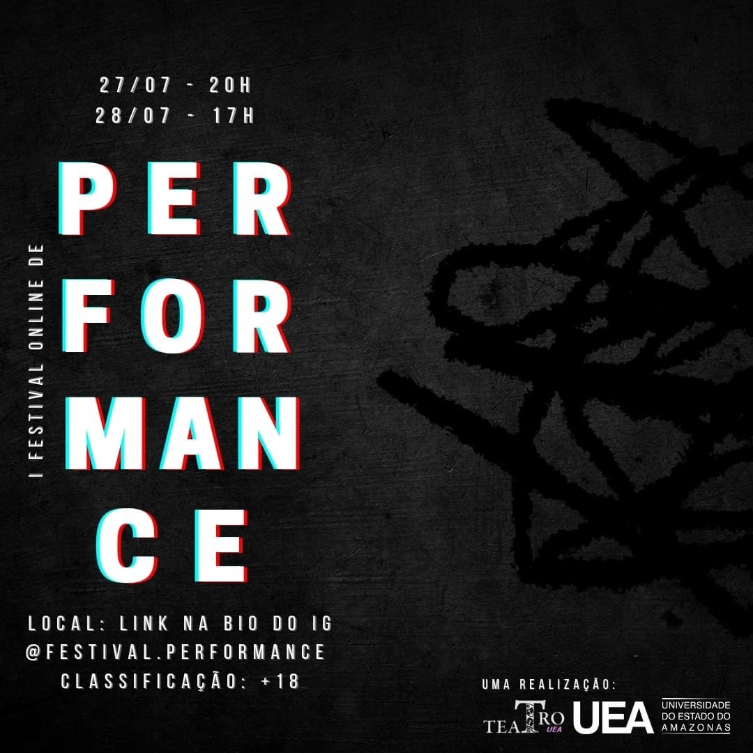 O Curso de Teatro da Escola Superior de Artes e Turismo da Universidade do Estado do Amazonas (ESAT/UEA) promove, nesta terça e quarta-feira (27 e 28/07), o 1º Festival On-line de Performance. Devido à pandemia de Covid-19, o evento deste ano acontece de forma remota, por meio da plataforma Zoom, mas mantém a proposta de estimular o diálogo entre a academia e a sociedade, refletindo acerca do espírito do tempo e das possibilidades de sobrevivência da linguagem cênica.