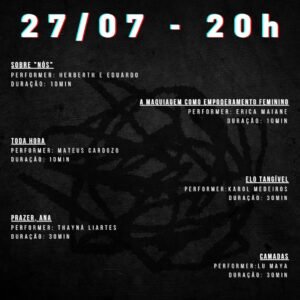 Durante os dois dias de atividades, 12 performers apresentarão processos criativos fundamentados nas investigações realizadas de modo interdisciplinar, com o componente Gestão e Produção Teatral, ministrado pelo professor Wellington Dias. Todas as apresentações possuem classificação indicativa para maiores de 18 anos.
