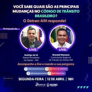 A live será às 18h e contará com o diretor-presidente do Detran-AM, Rodrigo de Sá, e com a participação do controlador regional de trânsito, Wendel Menezes, para explicar como essas mudanças no CTB vão afetar o cidadão e, principalmente, responder a perguntas da população sobre as alterações no Código de Trânsito.