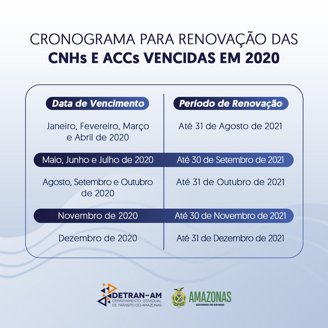 O Conselho Nacional de Trânsito (Contran) retomou, nesta quinta-feira (1º/07), os prazos para a renovação de Carteira Nacional de Habilitação (CNH), transferência de propriedade e licenciamento de veículos novos no Amazonas. O órgão nacional de trânsito também prorrogou os prazos das notificações de autuação e de penalidade, bem como os prazos de suspensão do direito de dirigir e de cassação da CNH em todo o estado.