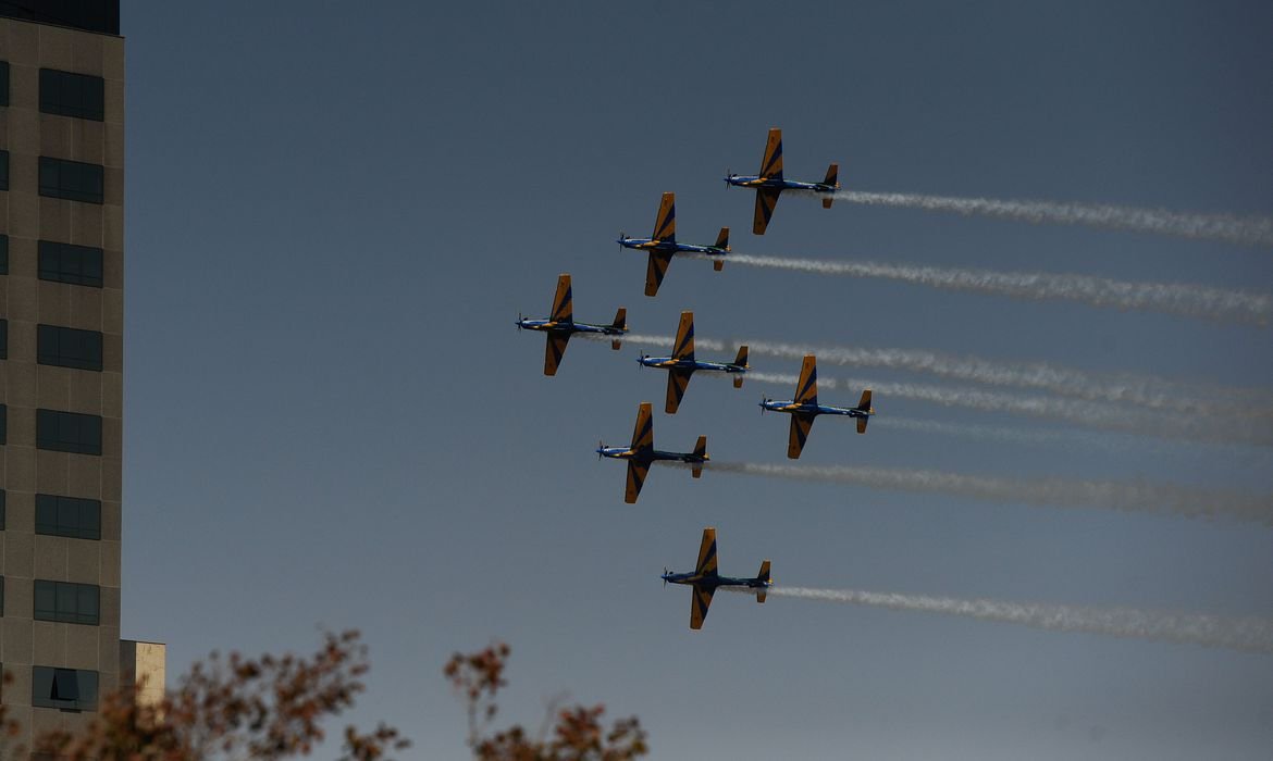 Anunciou-se, então, a chegada daquela que, em todas as apresentações do 7 de setembro, é a que mais agrada ao público: a Esquadrilha da Fumaça – que, a quase 3 mil metros do solo, já chega mostrando a que veio e escreve, no céu sem nuvens do planalto, “Ordem e Progresso”. O lema da bandeira desperta, de imediato, os aplausos da plateia.