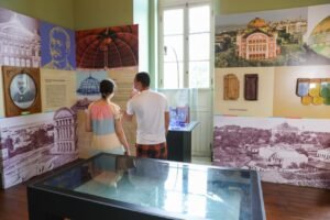 A mostra exibe uma linha do tempo e painéis informativos sobre a construção do patrimônio histórico