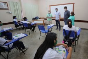 Em visita à Escola Estadual Gabrielle Cogels, no Puraquequara, zona leste de Manaus, Wilson Lima destacou as escolas como ambientes seguros e a importância do ensino presencial. “Esse é o momento de a gente começar a trabalhar para recuperar aquilo que a gente perdeu nos últimos seis meses. Nós estávamos trabalhando com aula virtual, com o ‘Aula Em Casa’, mas temos um ganho com o diferencial da presença do professor aqui na sala de aula para poder tirar as dúvidas, reforçando o acompanhamento do aluno”, disse Wilson Lima.