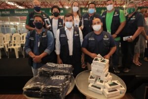O governador Wilson Lima acompanhou, nesta segunda-feira (08/11), no Centro de Convivência da Família Padre Pedro Vignola, na zona norte de Manaus, parte do último treinamento dos profissionais que irão atuar na distribuição dos cartões do Auxílio Estadual permanente, que inicia na quarta-feira (10/11). O benefício alcançará 300 mil famílias em todo estado, sendo 158 mil somente na capital. Servidores de oito secretarias de Estado receberam celulares e coletes para atuarem nos nove postos de distribuição espalhados pela capital.
