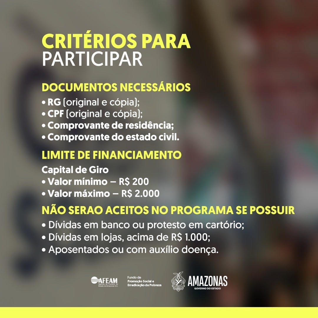Por meio do Crédito Solidário, a ação visa disponibilizar financiamentos com linhas de crédito para fomentar o mercado de trabalho na capital amazonense para mulheres empreendedoras em busca de inclusão no contexto socioeconômico. O valor disponível para cada cadastrada aprovada varia de R$ 500,00 a R$ 2 mil.