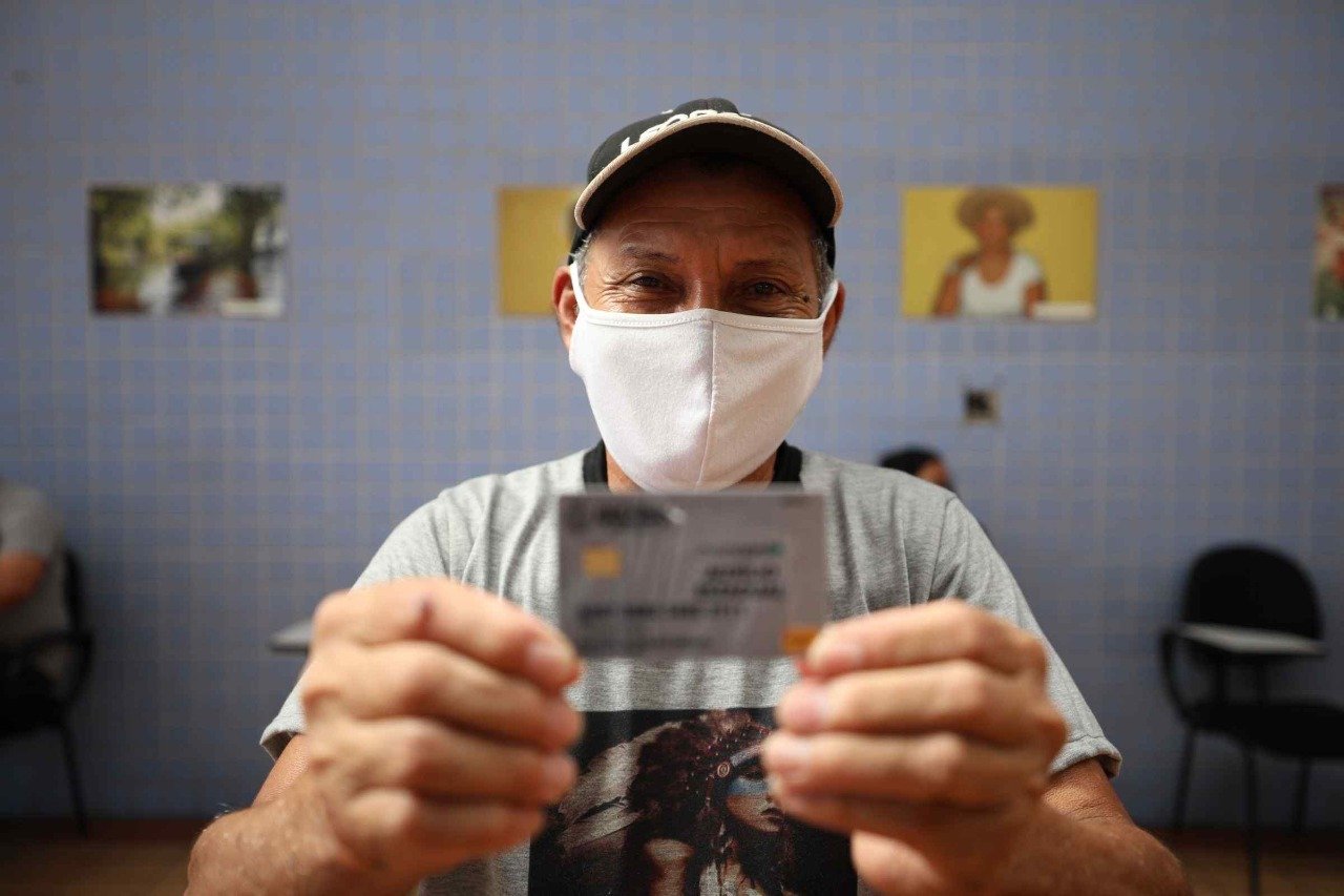 Benefício em mãos – Aproveitando o reinício dos trabalhos no Centro de Convivência, Zulma Mendes, de 52 anos, foi uma das primeiras beneficiárias a buscar o cartão na manhã de hoje (10/01). Ela conta que não conseguiu retirar o auxílio nos meses anteriores e reconhece a importância do valor para custear a alimentação da família.