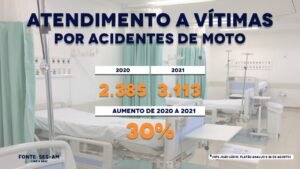 Números em alta – Os atendimentos nos três Hospitais e Prontos-Socorros (HPS) da Secretaria de Estado de Saúde (SES-AM) relacionados a acidentes de trânsito aumentaram 14% entre janeiro e abril de 2021, em comparação com o mesmo período do ano passado. O aumento foi impulsionado por acidentes envolvendo motocicletas, que cresceram 30%.