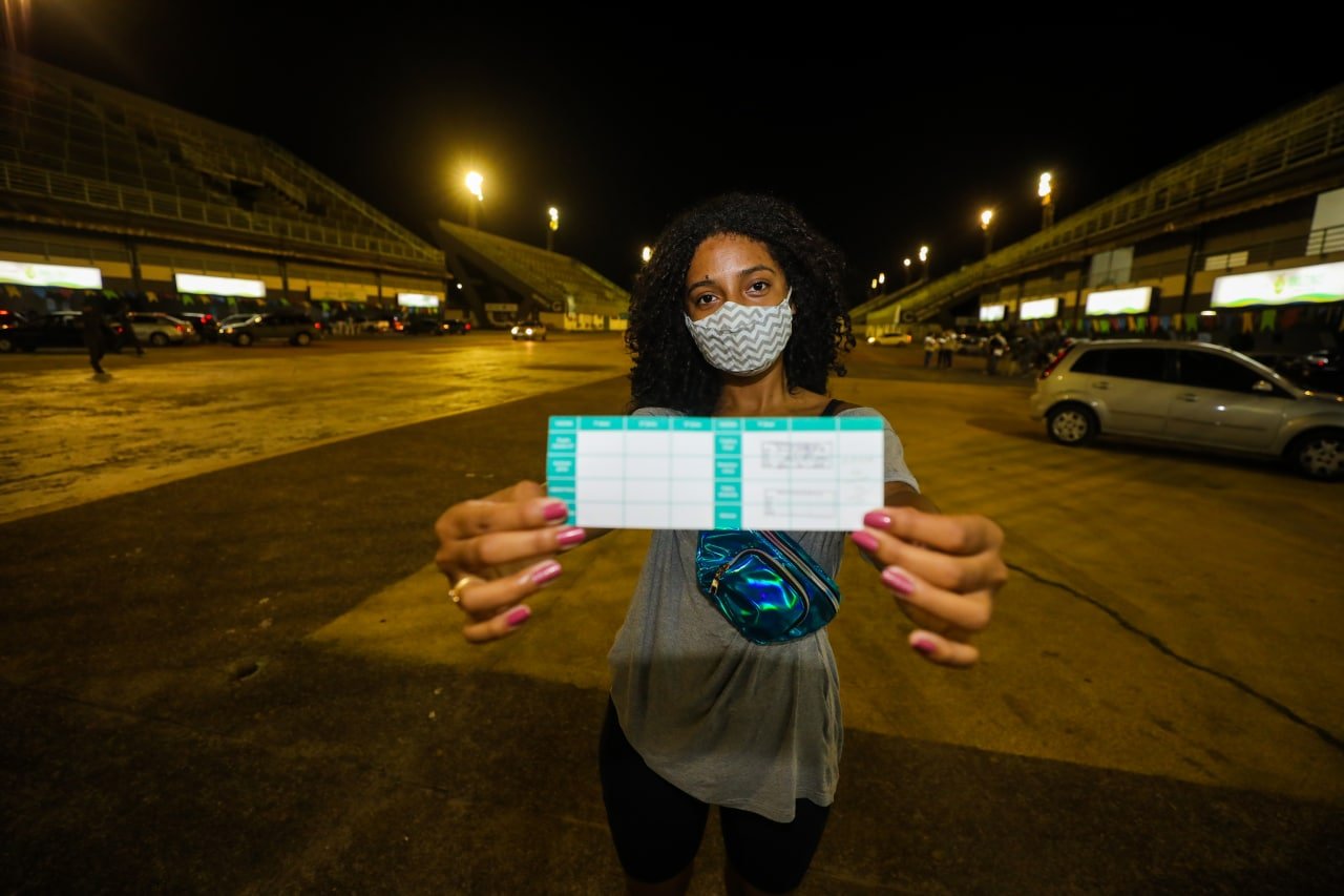 A vendedora Giovanna Souza também compareceu a um dos postos de vacinação montados na passarela do samba amazonense. Ela aproveitou o horário de funcionamento estendido, pela parte da noite, para garantir a primeira dose, logo após o expediente.