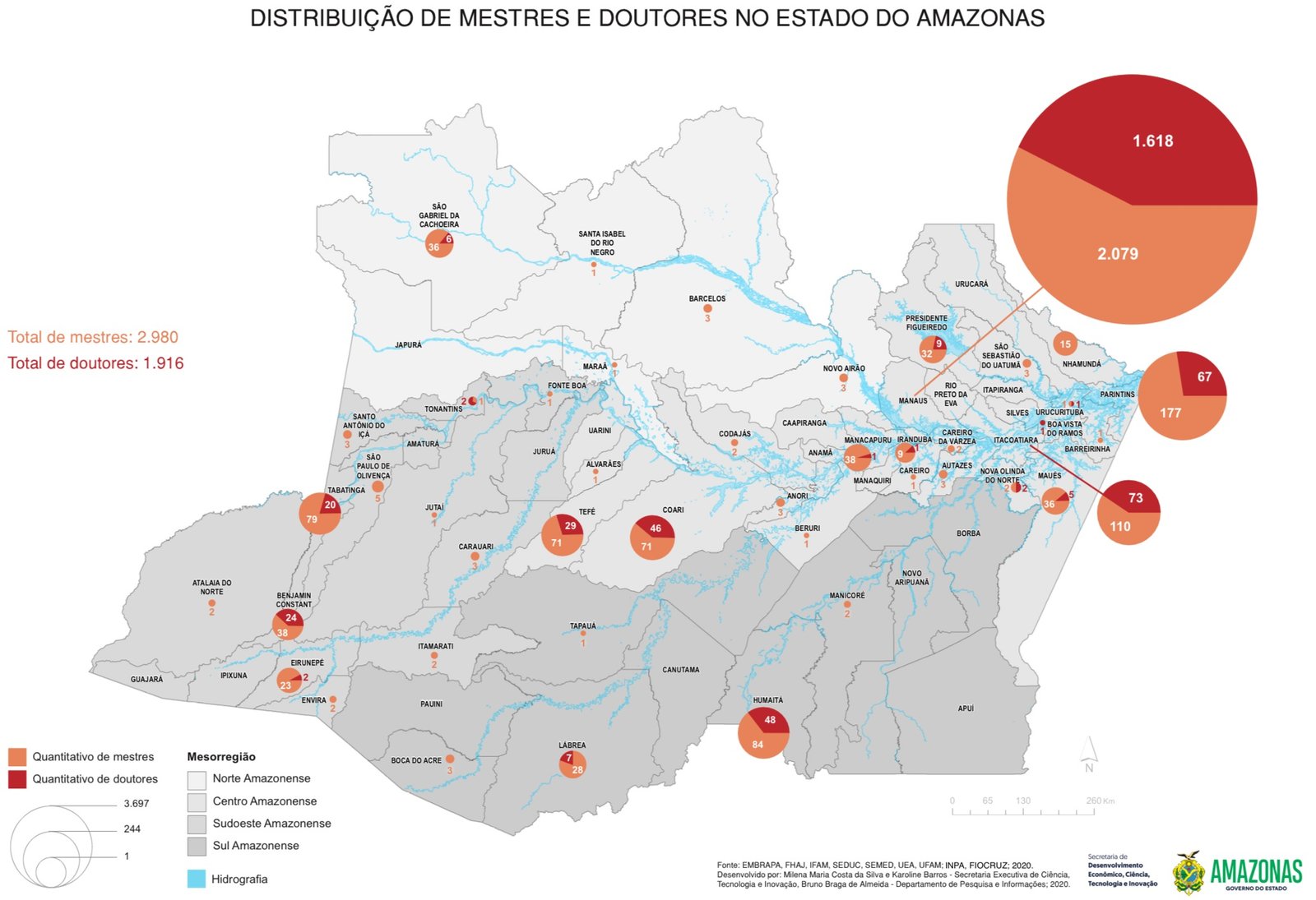 O estudo mapeou o quantitativo de mestres e doutores por município, apontando que 44 municípios, incluindo a capital, Manaus, têm pesquisadores baseados nas cidades e com atuação ativa, desenvolvendo pesquisas e estudos.