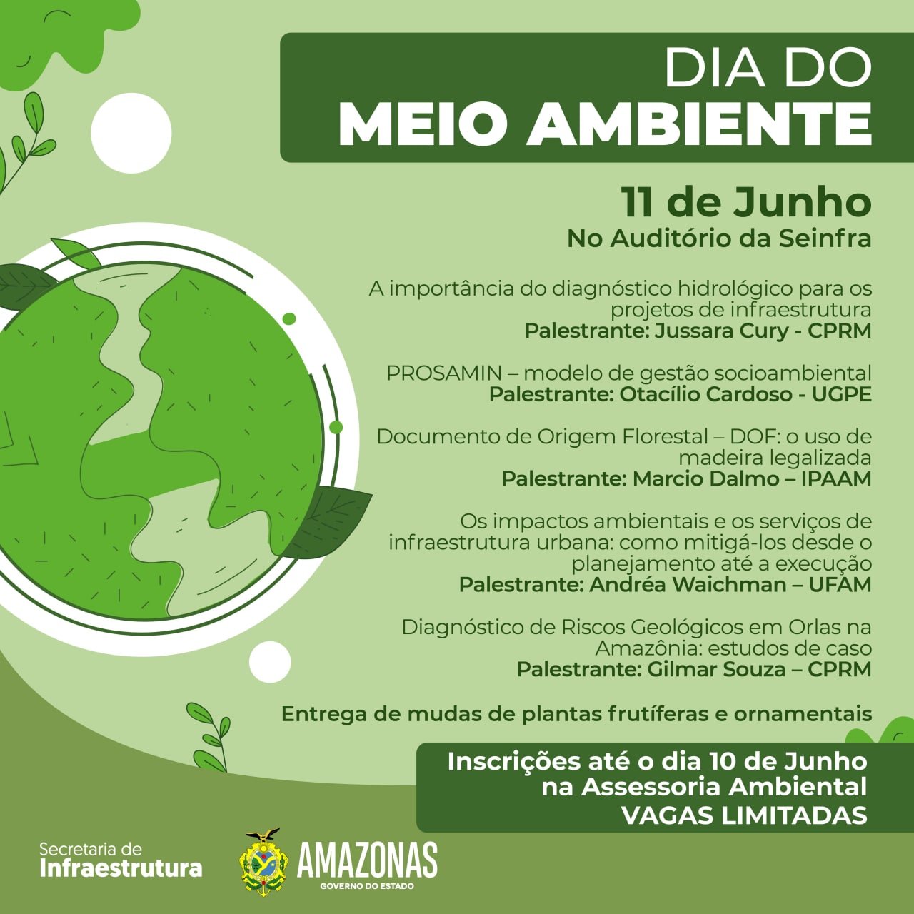 A Secretaria de Estado de Infraestrutura e Região Metropolitana de Manaus (Seinfra) realiza nesta sexta-feira (11/06), em seu auditório, a partir das 9h, um ciclo de palestras em alusão ao Dia Mundial do Meio Ambiente, comemorado anualmente no dia 5 de junho.