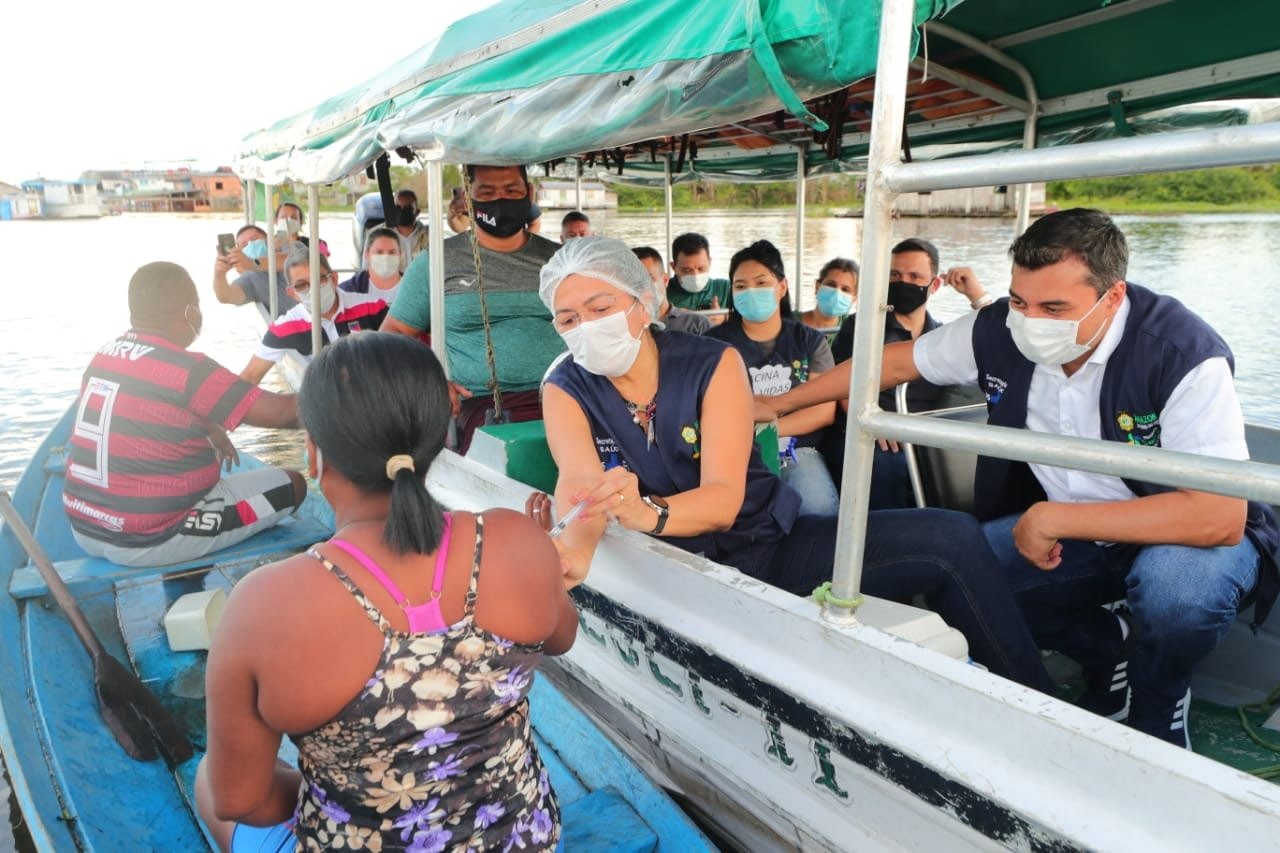 A grande novidade foi a modalidade drive-thru fluvial, realizada com o objetivo de levar a vacina contra a Covid-19 à população mais afastada do centro urbano. Ao fim da tarde, Milene de Almeida, 20, moradora de uma casa flutuante no entorno do distrito de Cacau Pirêra, foi vacinada na própria residência pelo secretário estadual de Saúde, o médico Anoar Samad, com a presença do governador Wilson Lima.