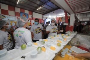 Por meio dos restaurantes populares Prato Cheio, gerenciados pela Secretaria de Estado de Assistência Social (Seas), quem comparece nas quadras se vacina e recebe marmitas com feijoada. Não é possível consumir a refeição nas quadras para não provocar aglomerações. Foram preparadas 5 mil refeições.