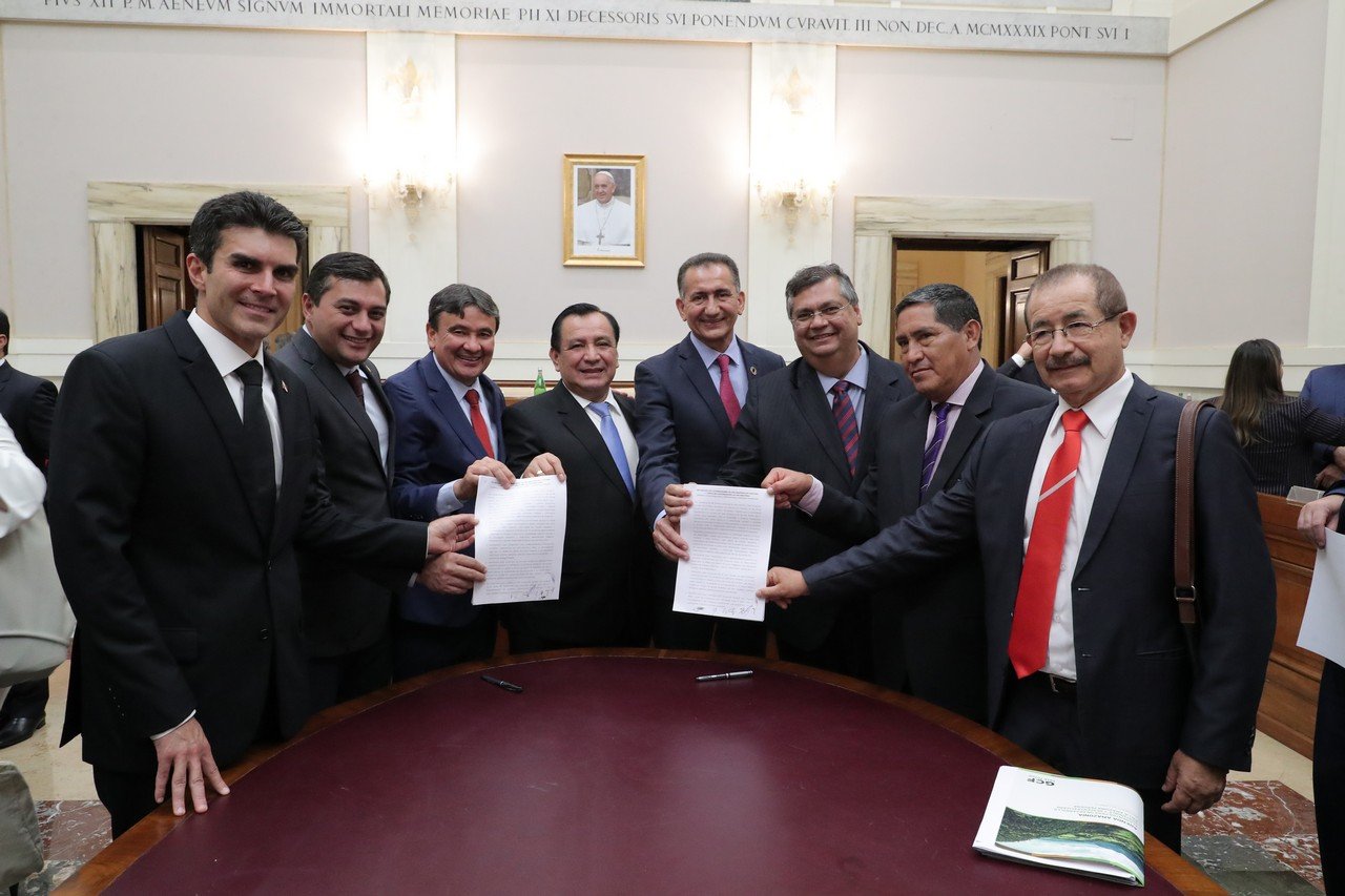 Carta – Os governadores assinaram uma declaração dos governadores da Pan-Amazônia. Eles destacaram a fundamental importância da Assembleia Especial do Sínodo dos Bispos para a região pan-amazônica, evento conduzido pelo Sumo Pontífice, o Papa Francisco, que, na visão dos chefes de estado, ampliou o chamamento em defesa da Amazônia e de um modelo de desenvolvimento sustentável com ênfase na justiça social, solidariedade, respeito à natureza e às populações originárias e tradicionais, especialmente indígenas.
