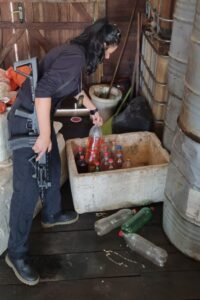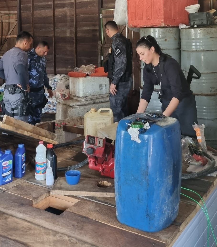 Durante a operação, foram apreendidas 18 garrafas plásticas de dois litros contendo gasolina, uma bomba de abastecimento e três tanques de 60 litros.