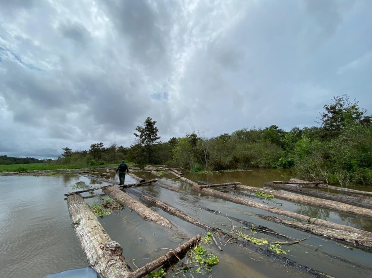 Durante patrulhamento fluvial, por volta das 10h, a equipe policial ambiental avistou uma jangada no rio com toras de madeira serrada e procedeu a abordagem de rotina. Os policiais solicitaram a documentação legal e obrigatória, porém o indivíduo que estava no local informou que não possuía. Em continuidade ao patrulhamento, quando os militares se aproximavam do Lago Supia, avistaram uma embarcação e outra jangada, cujo responsável também informou não possuir o documento legal.