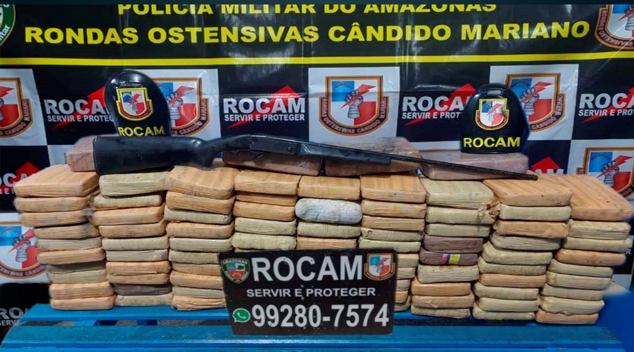 Interior – Policiais das Rondas Ostensivas Cândido Mariano (Rocam) apreenderam 95 quilos de maconha do tipo skunk, uma espingarda e um cartucho intacto, em um sítio localizado na rodovia AM-010, no município de Rio Preto da Eva (a 57 quilômetros da capital). Um homem, de 53 anos, foi preso em flagrante por tráfico de drogas durante a ocorrência.