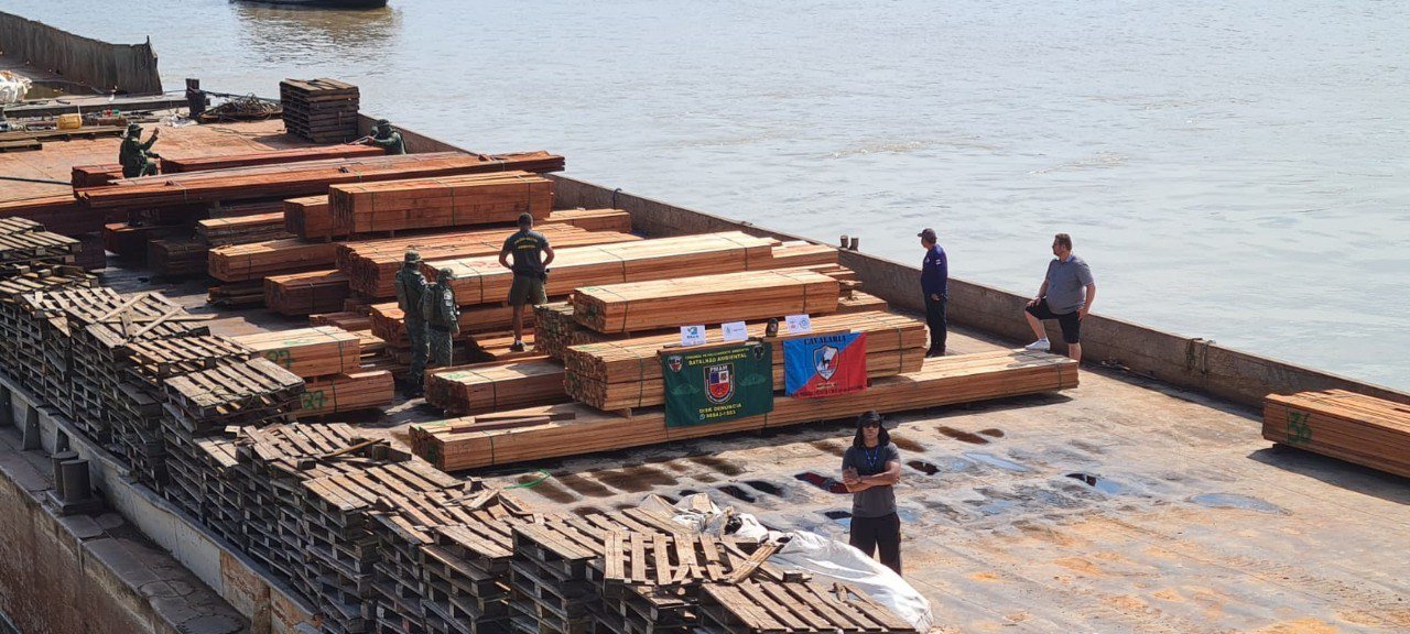 Em fiscalização naquele município, os policiais flagraram uma balsa e um empurrador atracando no porto do Pindoba, transportando aproximadamente 100 metros cúbicos de madeira serrada. Durante as diligências, o proprietário da carga apresentou três Documentos de Origem Florestal (DOF), sendo dois válidos e um inválido, totalizando 40,97 metros cúbicos de madeira serrada documentada. O restante da madeira em excedente o proprietário não apresentou o DOF.