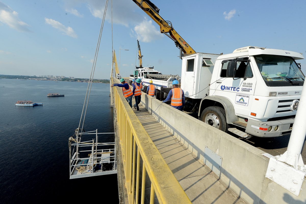 Para a realização deste serviço com absoluta segurança dos operários e dos motoristas, a Amazonas Energia solicitou a interrupção de uma via da ponte para que seja feita preparação e o içamento das equipes de montagem dos suportes e instalação dos condutores.