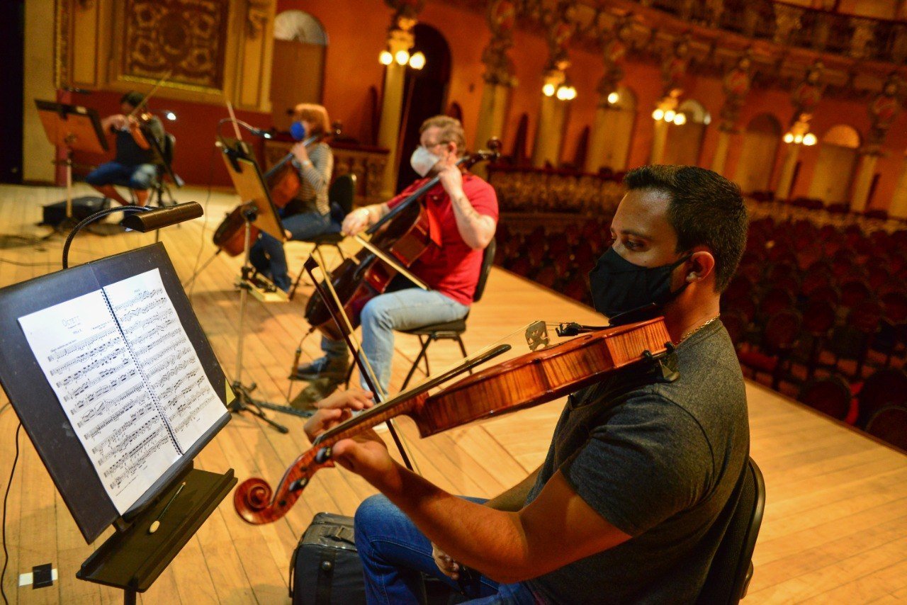 A Filarmônica continua adotando uma formação de câmara, com poucos músicos no palco, para evitar aglomeração durante o período de pandemia. “É um concerto sem maestro, em que eles precisam ensaiar muito e aprimorar os ouvidos. Desta forma, são eles que criam a identidade sonora da obra, desde a concepção até o produto final”, ressalta Marcelo de Jesus.