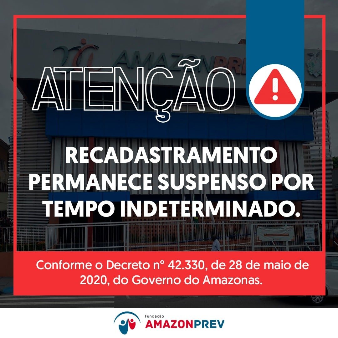 O recadastramento obrigatório para aposentados e pensionistas do Governo do Estado e que recebem seus proventos pela Fundação Amazonprev permanece suspenso e sem previsão de retorno. O Decreto n° 42.330, de 28 de maio de 2020, que interrompeu a prova de vida, determina que o serviço se mantenha inoperante até que novas determinações governamentais sejam tomadas a partir da normalização segura nos parâmetros de controle da Covid-19.