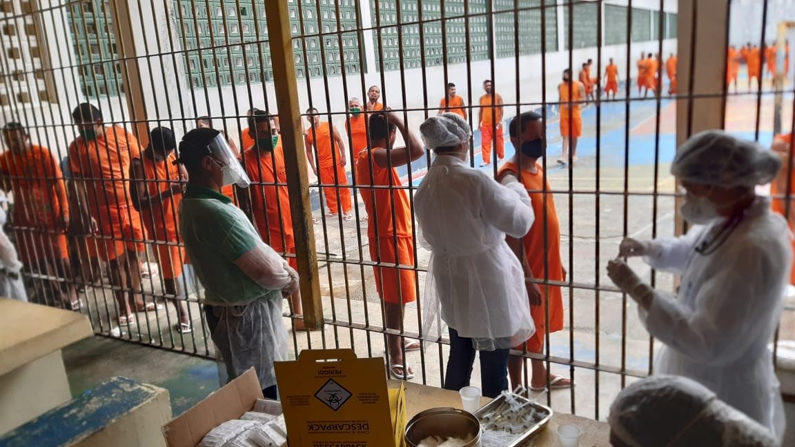 Hoje, 600 apenados foram imunizados. Ao final do mutirão, o número total de internos medicados no Compaj será de 1.200. Dez profissionais de saúde estão trabalhando na ação.
