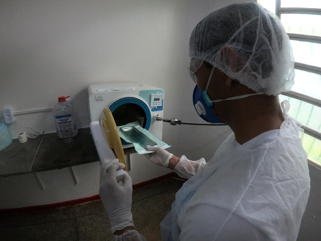 A sala é utilizada para pré-lavagem, lavagem, secagem, empacotamento e esterilização dos materiais médicos e odontológicos utilizados pela equipe de enfermeiros, técnicos de enfermagem, dentistas e a auxiliar de saúde bucal, que atuam no CDPM 1. Os equipamentos disponibilizados para a realização dos serviços são autoclave, seladora e incubadora.