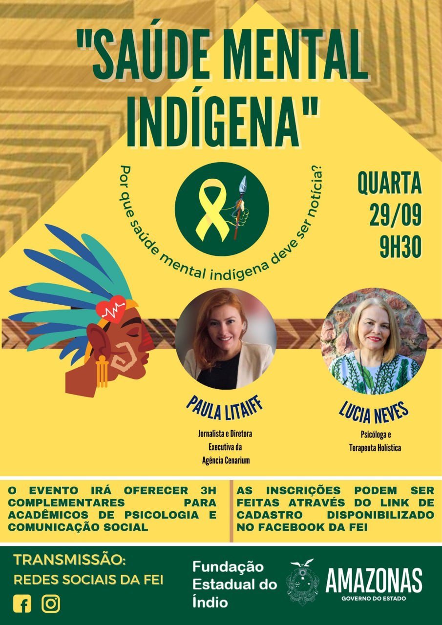 A Fundação Estadual do Índio (FEI), do Governo do Amazonas, irá promover no dia 29 de setembro a live “Saúde Mental Indígena”. Com o objetivo de levar informação acerca da campanha Setembro Amarelo, a transmissão será realizada às 9h30, por meio do Facebook e Instagram da instituição.