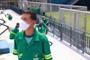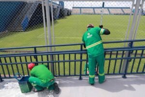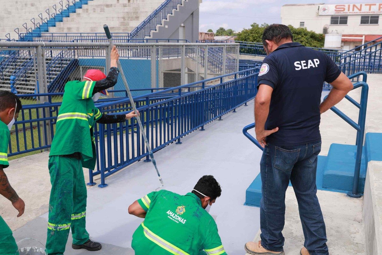 No Estádio da Colina, Rafael (nome fictício), 35, executa a função de pintor nos serviços de manutenção do espaço, envolvendo outros apenados, divididos em equipes. Ele conta que aprendeu a atividade em pequenas tarefas no Complexo Penitenciário Anísio Jobim (Compaj), de onde evoluiu para regime semiaberto em 2018, e agradece pela porta de emprego aberta pelo Governo do Amazonas.