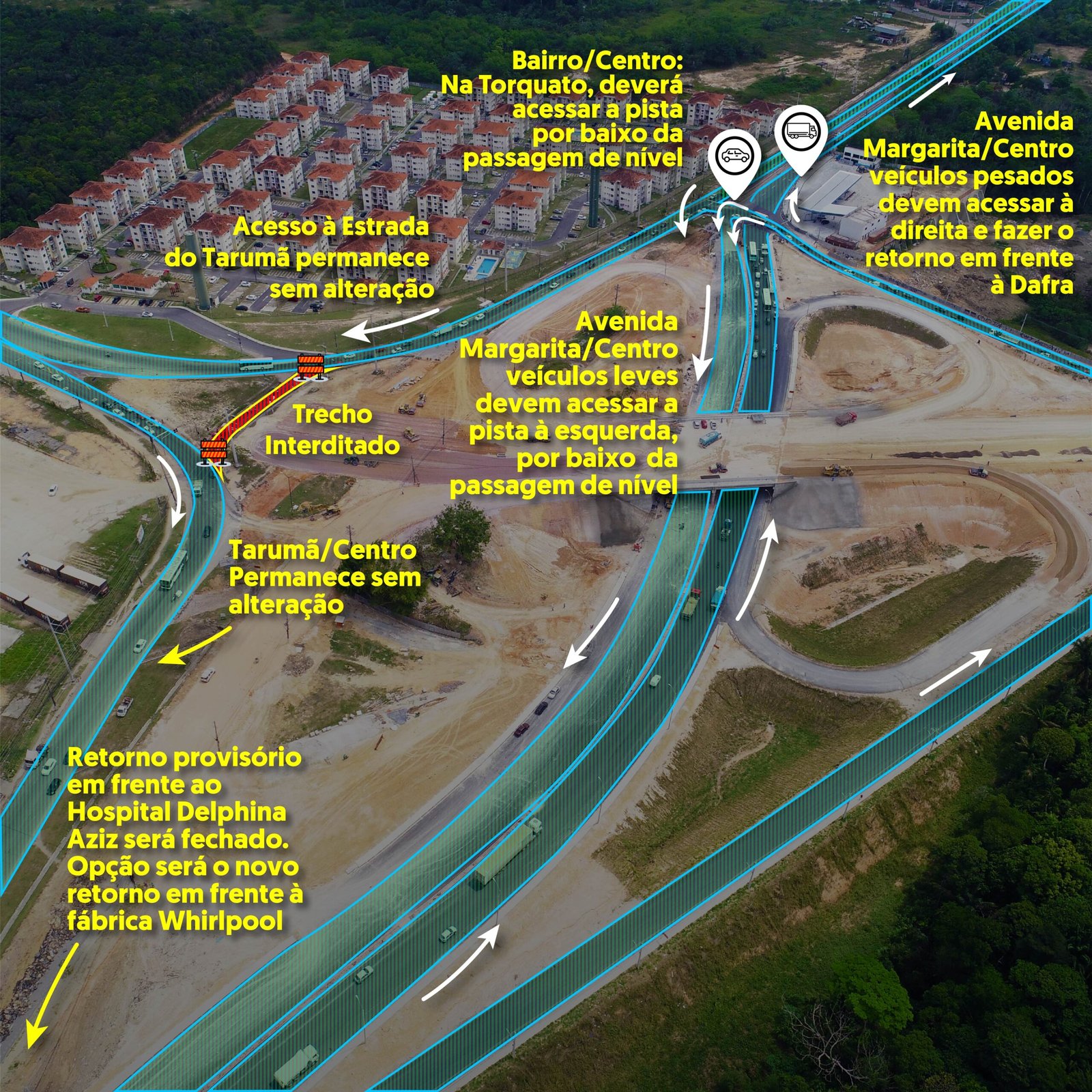 Esse desvio será interditado para dar lugar às obras de construção da pista de interligação entre a Estrada do Tarumã e a avenida Arquiteto José Henriques em direção à avenida Margarita. O acesso será controlado por semáforos colocados nas duas pistas, José Henriques e Torquato Tapajós.