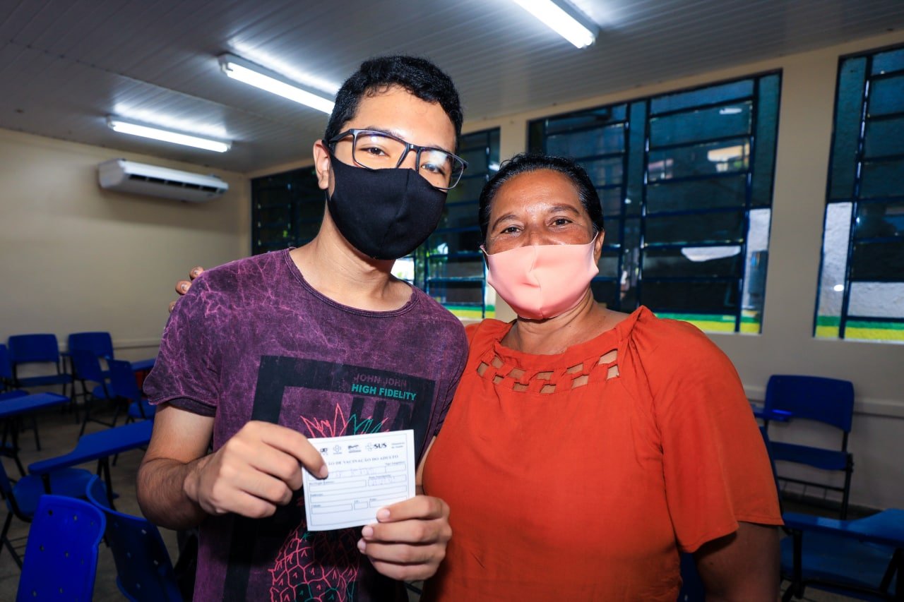 Vacina é vida – Em outro posto de vacinação, localizado na Escola Estadual Isaías Vasconcelos, a professora Lindonete Andrade, 47, acompanhava o filho Jeremias Sampaio no momento da vacinação. Emocionada, Lindonete descreveu o sentimento como uma “nova vida” para o filho de apenas 17 anos de idade.