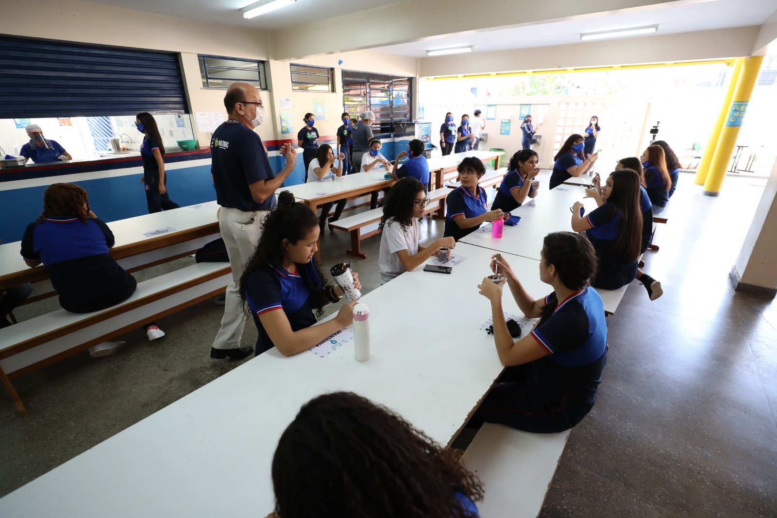 As medidas de prevenção estabelecidas pelo Governo do Amazonas no retorno às aulas na rede pública de ensino, nesta segunda-feira (10/08), abrangem vários setores do ambiente escolar, entre eles a merenda nos intervalos, que segue também os protocolos necessários de prevenção. As medidas adotadas nos espaços das escolas incluem o escalonamento de turmas para o lanche, a organização nos assentos e a higienização das mãos e máscaras.