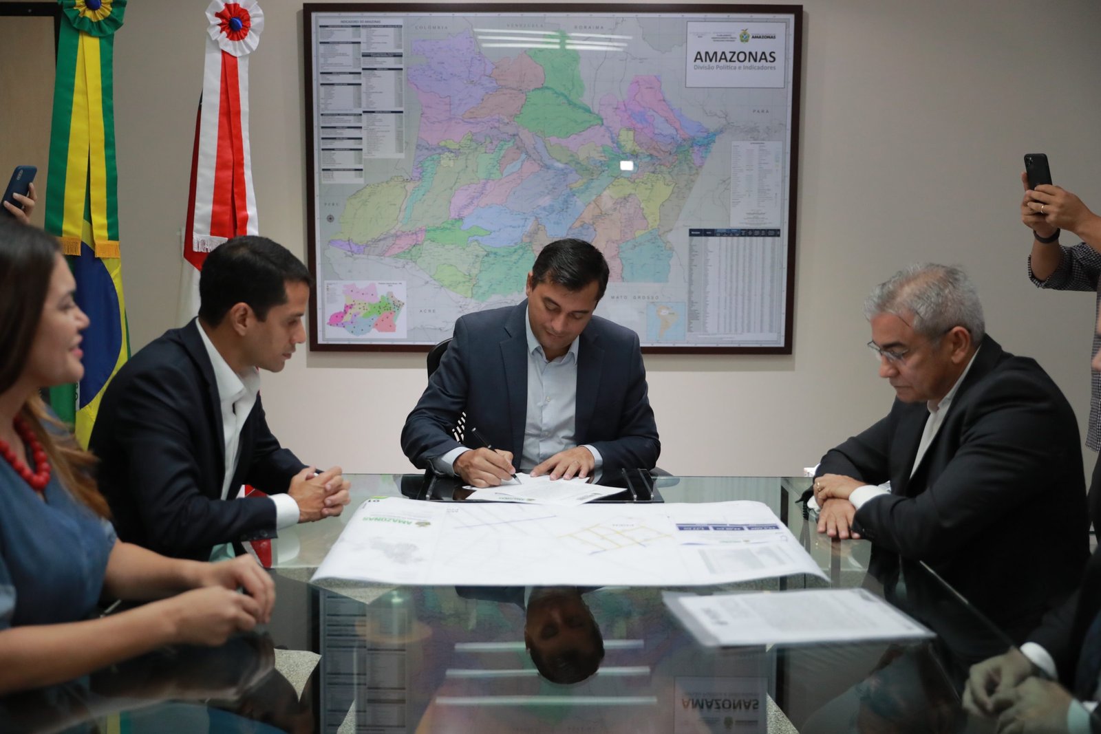 A assinatura, realizada durante reunião na sede do Governo, zona oeste de Manaus, contou com a presença dos prefeitos Junior Leite (Maués) e Normando Bessa (Tefé).