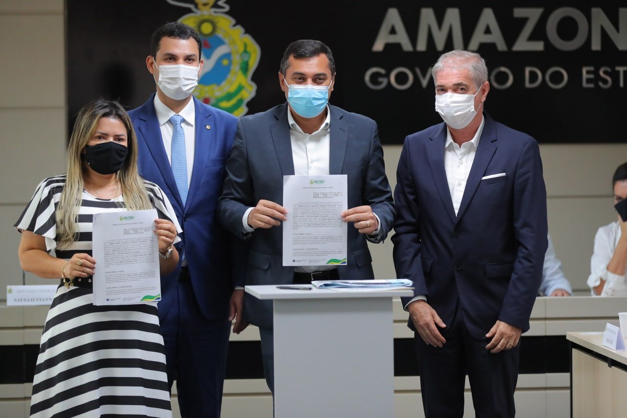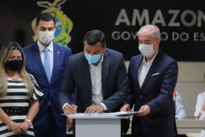 O Governo do Estado, por meio da Companhia de Saneamento do Amazonas (Cosama), vai ampliar a rede de distribuição de água no município de Nhamundá, a 383 quilômetros de Manaus. O Termo de Cooperação Técnica de R$ 1.872.219,89 foi assinado nesta quinta-feira (06/05), pelo governador do Amazonas, Wilson Lima; pela prefeita de Nhamundá, Marina Pandolfo; e pelo diretor-presidente da Cosama, Armando do Valle.